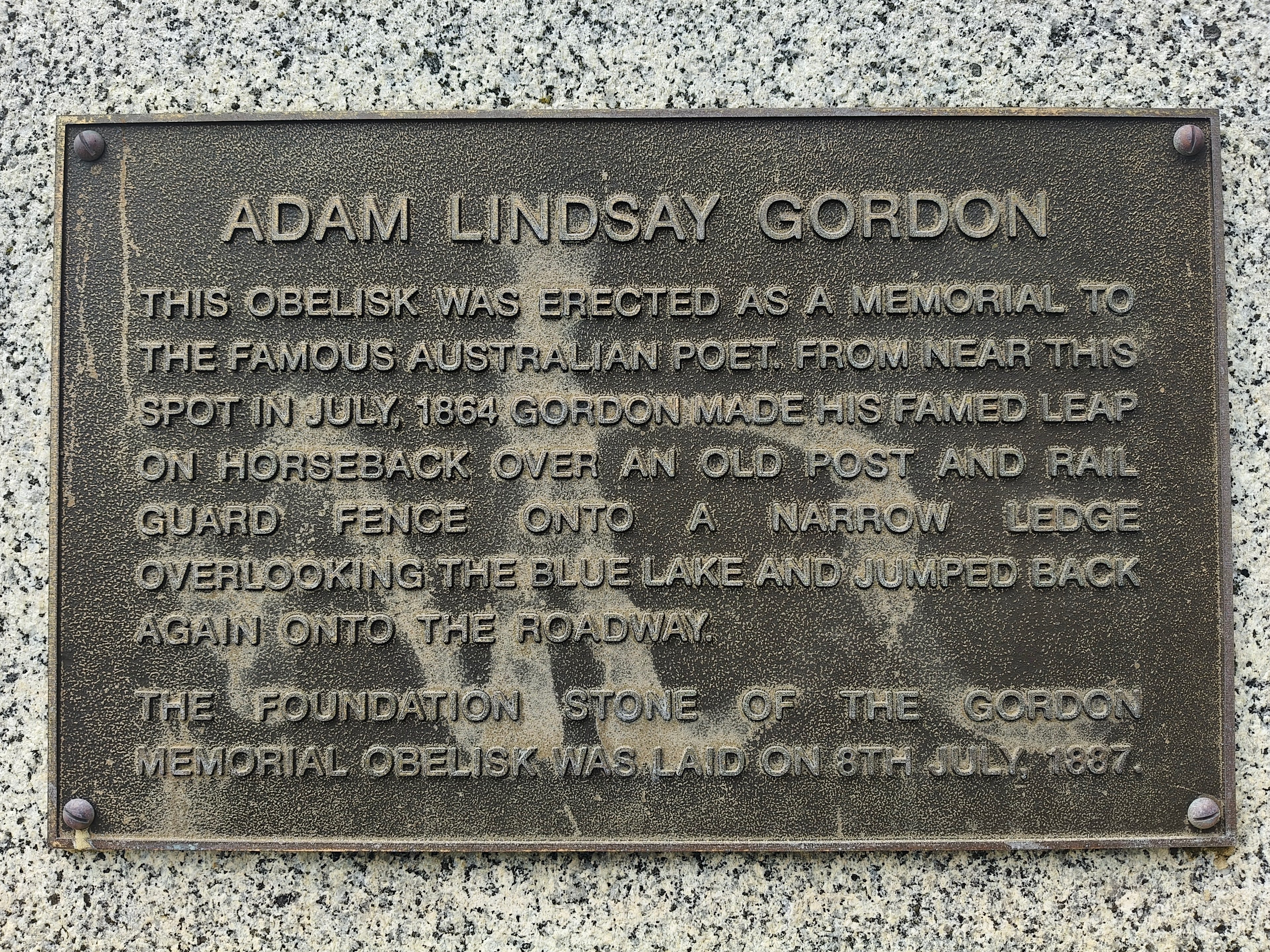 In 1887, when Riddoch laid the foundation stone for the obelisk that commemorates the leap today—a piece of solid granite rising from a base of grey and pink dolomite—he correctly noted that “some people may be inclined to question the wisdom of our commemorating the performance of such a feat”. He also made it clear that, as far as the district was concerned, Gordon’s horsemanship was every bit as important as his poetry: