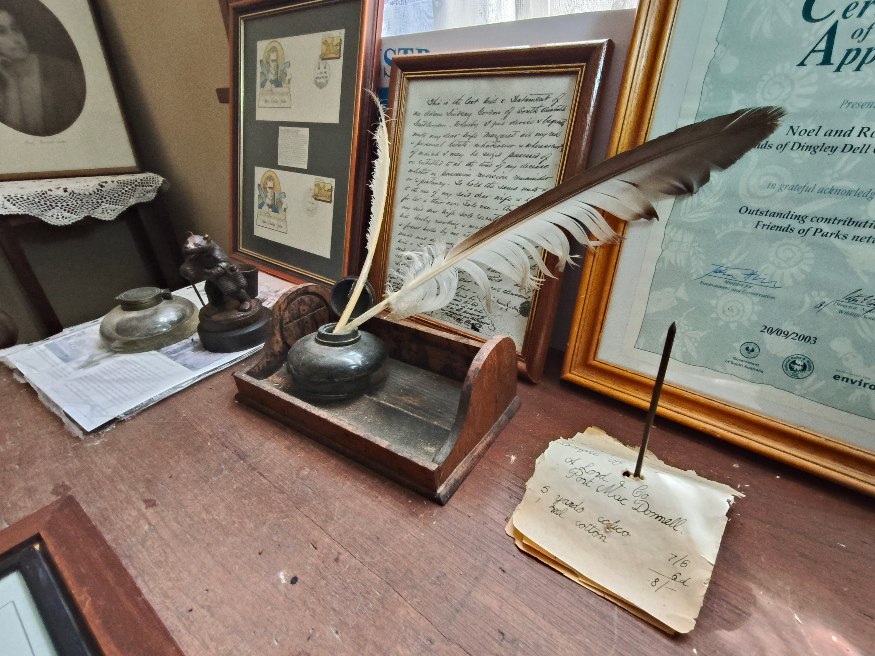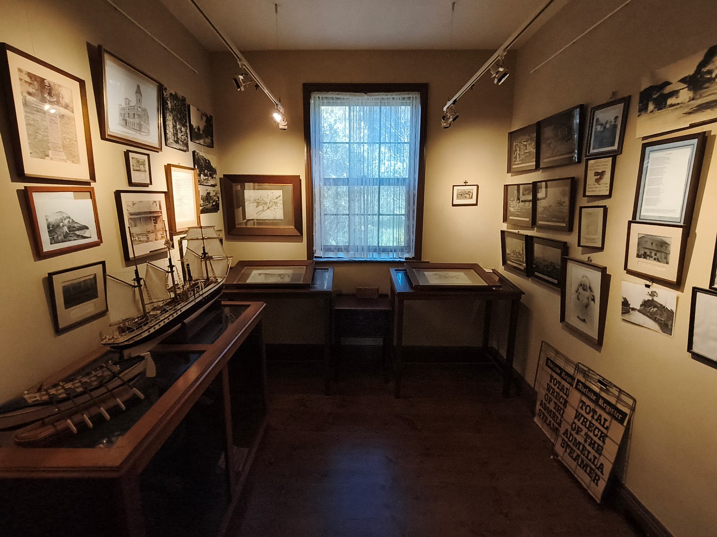 The second room on the left is what remains of his museum. While many of the more important artefacts are now in storage somewhere in Mount Gambier, the room is still very busy. Scenes from ‘How We Beat the Favourite’ line the walls in dusty picture frames, portraits jostle for space alongside newspaper clippings and sketches of Gordon’s homes. A model of the Admella sits on a glass case containing a trooper’s saddle—“similar to that used by Gordon,” we’re told—as well as Margaret’s sidesaddle.
