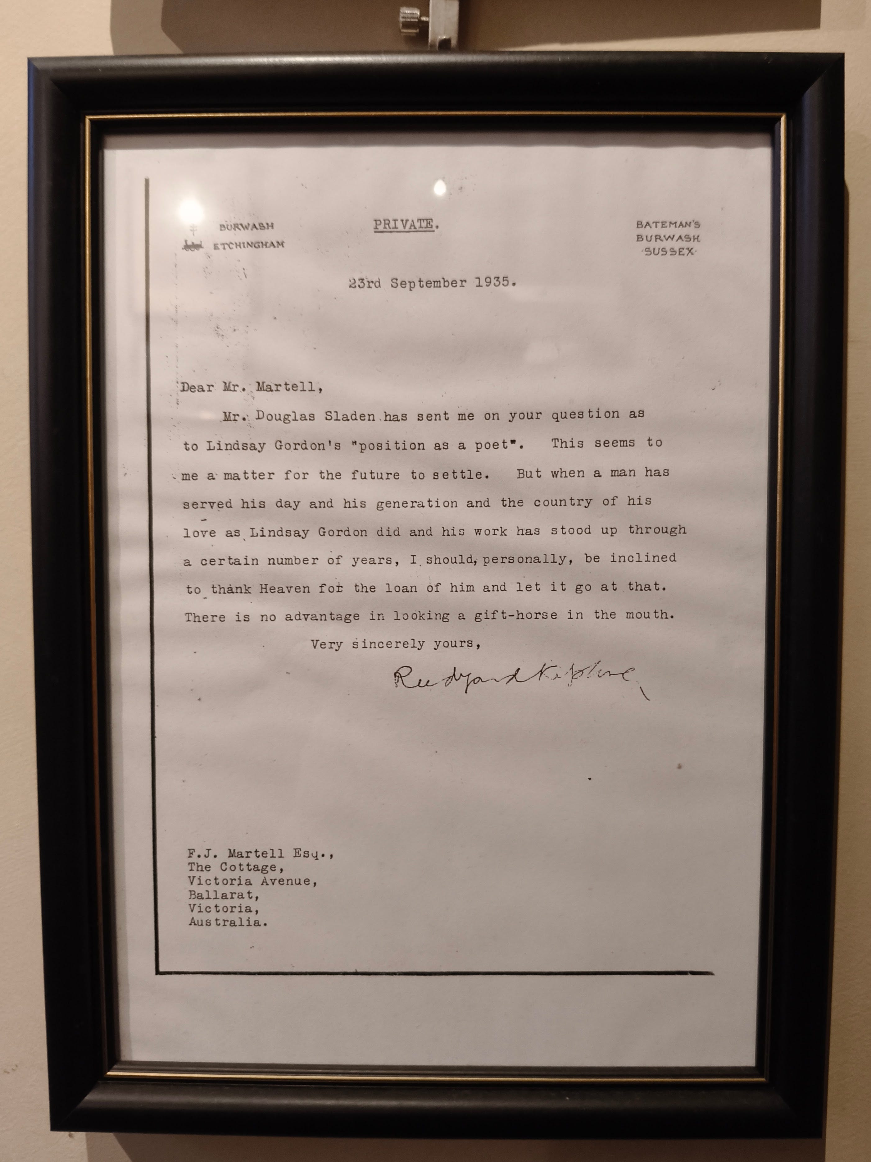The second letter is even more striking. It is addressed to F. J. Martell, who was instrumental in having Gordon’s Ballarat cottage moved to the town’s botanical gardens: