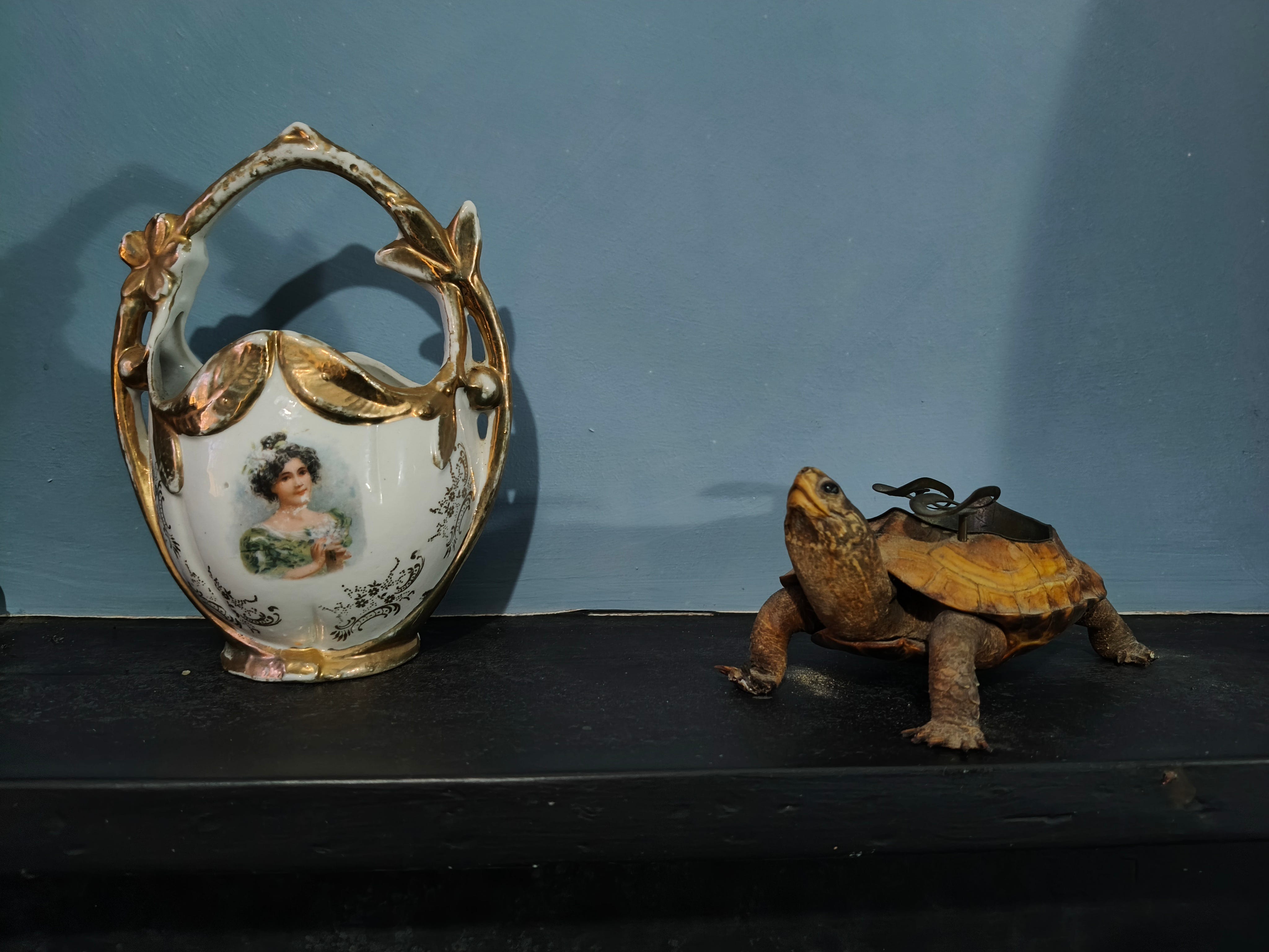 For whatever romantic reasons of my own, I had expected something a little smaller, a little more utilitarian. In fact, it’s spacious as cottages go, with four rooms leading off from a central hallway decorated with equestrian prints and presided over by a glowering portrait of Queen Victoria. I unroped each of the rooms in turn. The first on the left was a sitting room, containing portraits of Gordon and his wife, an upright piano, a violin, and an ancient squeezebox. An ashtray designed to look like a tortoise, apparently from 1853, sat on the mantle. The bedroom is across the hall. The next room down on the right is the study—or rather has been fashioned as a study—complete with a seagull feather in an empty inkwell and a library that includes three secondhand copies of Edith Humphris and Douglas Sladen’s 1912 biography of the poet and several tattered editions of his poems.