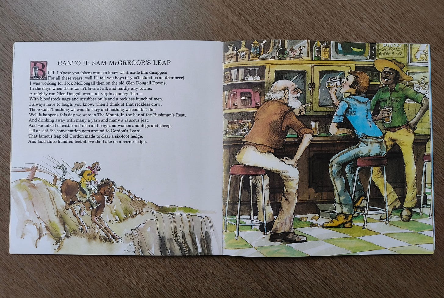 There are lot of inconsistencies in the accounts of Gordon’s leap. According to some, the poet was riding with a group of friends at the conclusion of Mount Gambier’s Border Steeplechase, in which he’d placed third, and others that he was out hunting kangaroos with only one close friend for company. (The friend in question, William Trainor, was more than a little obsessed with Gordon, buying and ultimately occupying the burial plot next to the latter’s grave. If he was the only man present on the day, you’d have to take his claims with a whole shakerful of salt.) The author of an 1897 guide to popular South Australian cycling tours was sceptical that the leap had happened at all. “From a brave jump the account has now assumed proportions sensational even in fiction,” he wrote. It doesn’t help that the monument wasn’t installed until more than twenty years had passed, and that no one knew then, and certainly doesn’t know now, where exactly the leap is supposed to have taken place. I am reminded of Graham Jenkin’s children’s book, The Ballad of the Blue Lake Bunyip, which exposed me to the story as a child. Two stockmen have ridden into Mount Gambier and an old-timer is bending their ears over a beer:
