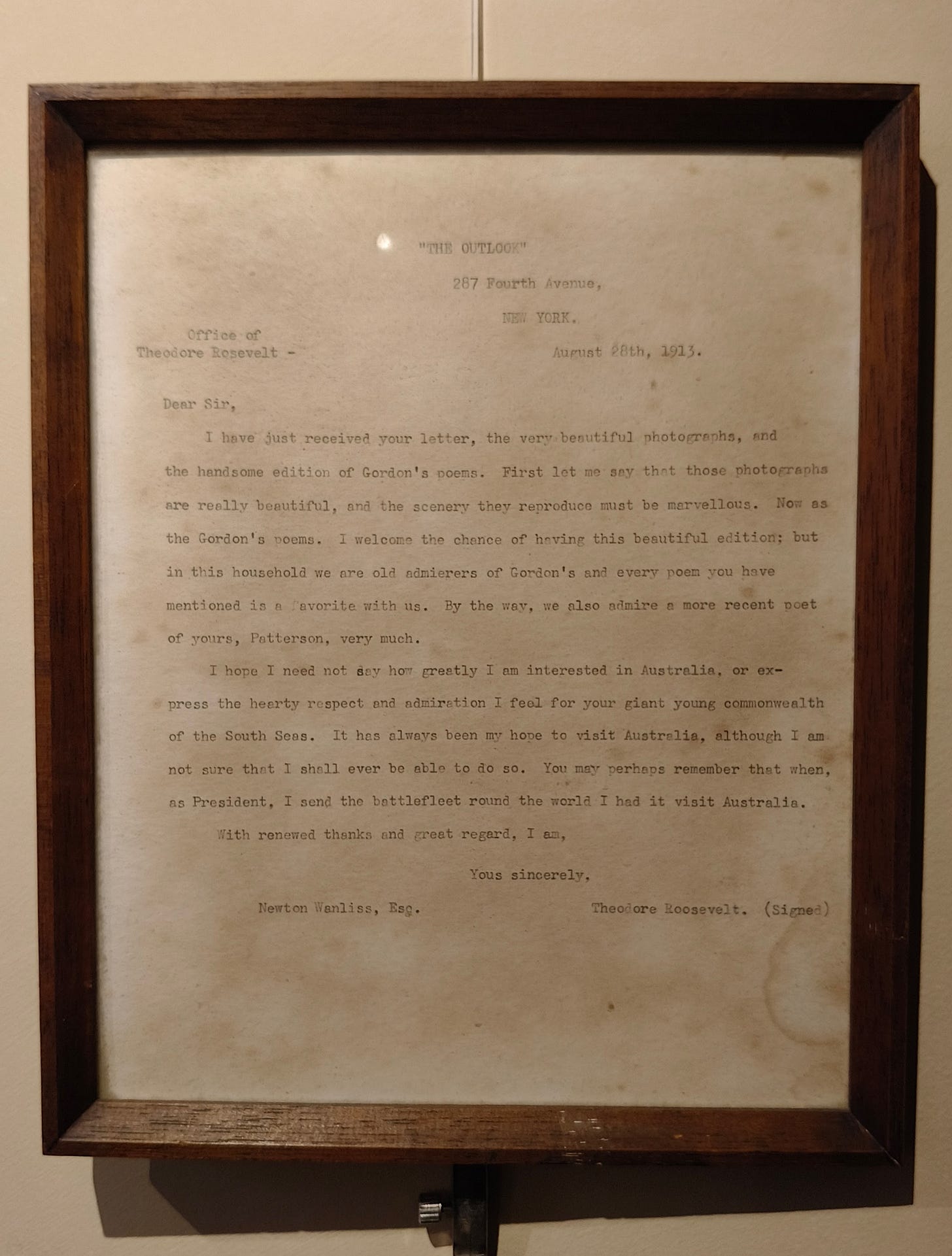 But what caught my eye were the two framed letters, each in facsimile, to the right of the doorway. The first was written in the offices of The Outlook, a magazine headquartered on Fourth Avenue in New York City, by former US president Theodore Roosevelt:
