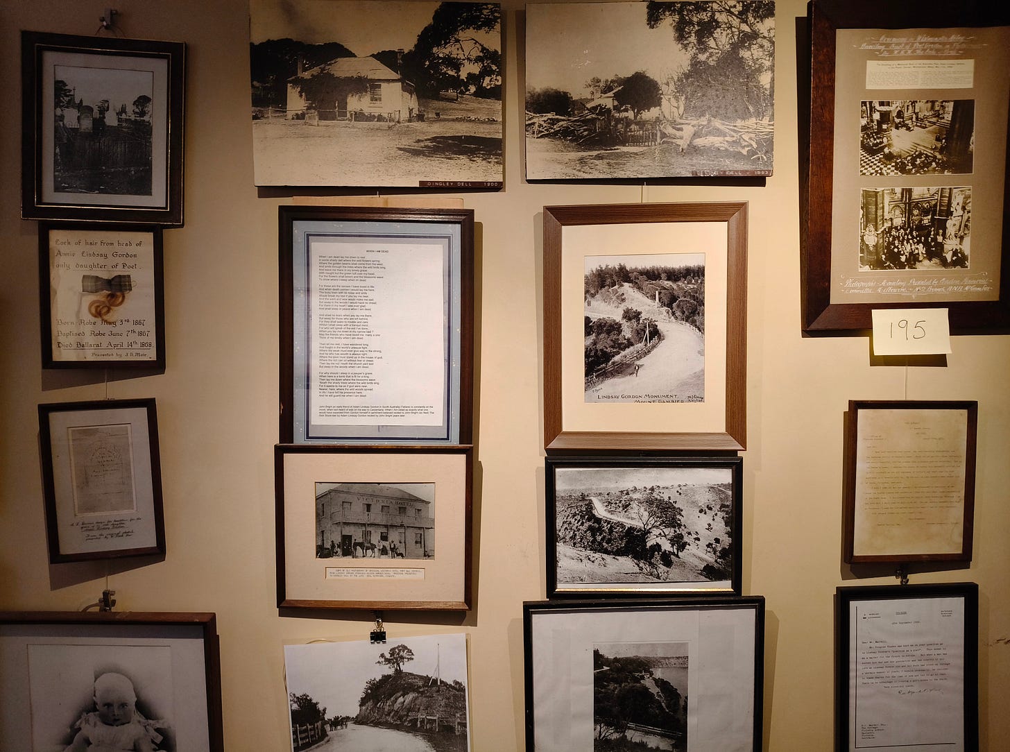 Don’t get me wrong, though. It’s still kind of weird. Sparrow writes of a tree stump in Brighton that bears a plaque commemorating the fact that Gordon once tethered his horse to it. In a room off the kitchen at the back Dingley Dell, which is used for storing old visitor pamphlets, I discovered a bulging folder of ephemera that included a letter from Queen Elizabeth II’s Deputy Private Secretary, politely declining an invitation to Her Majesty to become a patron of the Adam Lindsay Gordon Commemorative Committee, and an entry form for the Esperanto Federation of Victoria’s Adam Lindsay Gordon Esperanto Poetry Competition. Rather more offputtingly, there is a lock of hair belonging to Gordon’s daughter, Annie, on the wall of the museum, as though it were a kind of religious relic. Annie was ten months old when she died. I don’t think her hair needs to be on display.