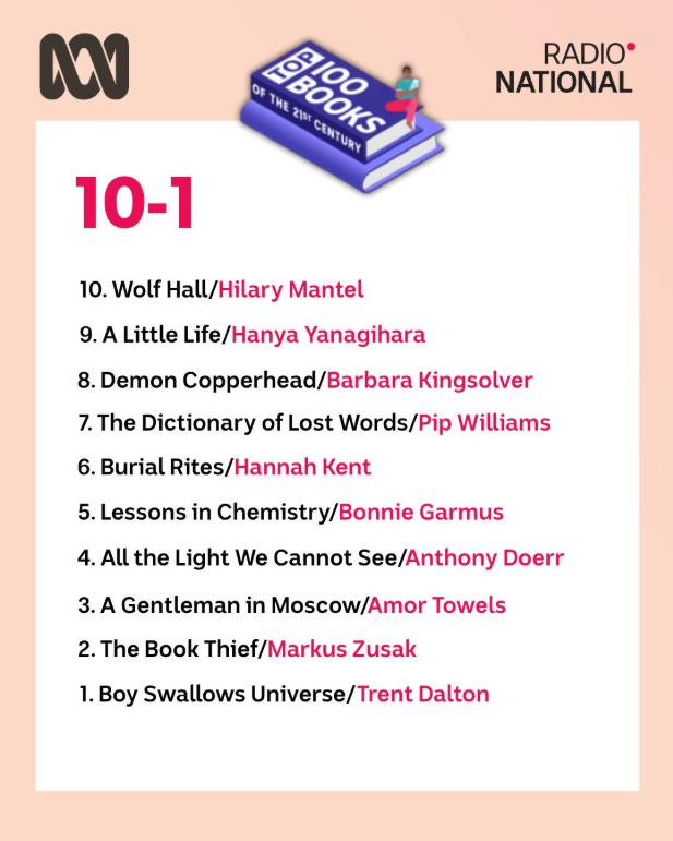 There are a couple of things that jump out at you here. The first is recency bias, with only The Book Thief and Wolf Hall predating 2010. (Recency bias explains a lot about the list, such as the presence of Charlotte Woods’ Stone Yard Devotional but not her Stella-winning The Natural Way of Things. I can’t imagine there’s any other explanation for why Zadie Smith’s White Teeth—number thirty-one on the New York Times’ recent version of this stunt—didn’t make the cut at all, while Funder’s Wifedom, which is not a good book, appeared at number seventeen. It’s amusing to me that the year with the most books on the list was 2023, which suggests that a lot of people simply voted for the last book they could remember reading.) The second thing that jumps out at you is the fact that more than half of the books in the top ten have been adapted for the screen. It would be interesting to know how many people caught the adaptations on Netflix or Apple before actually, if ever, reading the books, and to know as well how difficult or otherwise the screenwriters found the task of adaptation. The third is that Australia is apparently responsible for four of the top ten books of this century. I know that the poll was an Australian one, but this is obviously ridiculous.