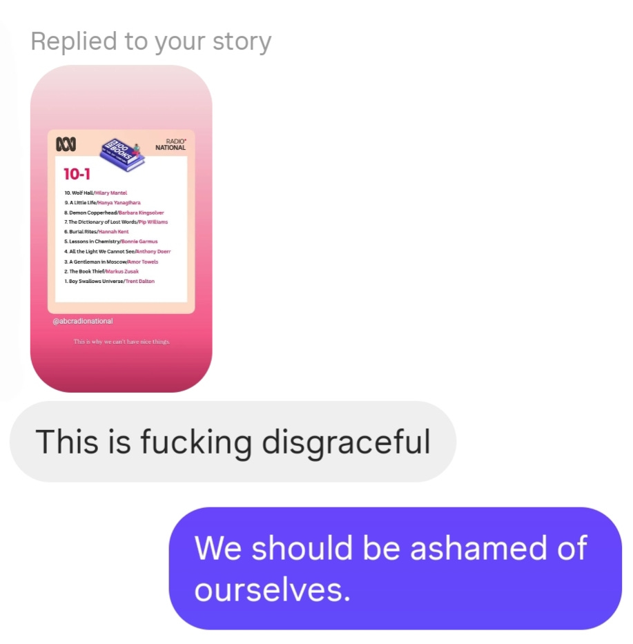 I know that middlebrow taste isn’t unique to Australia, and that it isn’t anything new. (Whenever I’m feeling down about what other people are reading, which is in any case a ridiculous thing to feel, I always go back to Orwell’s essay about working in a bookstore: “[O]f all the authors in our library the one who ‘went out’ the best was—Priestley? Hemingway? Walpole? Wodehouse? No, Ethel M. Dell, with Warwick Deeping a good second…” Perhaps Trent Dalton is our Ethel M. Dell?) I know, too, that to have a national radio network that’s willing to dedicate an entire weekend to books is, whatever the actual content of the broadcast, a positive thing for which we should be grateful. At the same time, I can’t help but feel that RN’s list, and especially its top ten, says something kind of depressing about what books we value, why we value them, and how we talk about that value. I’m not sure whether it’s a chicken-and-egg scenario or a tail-wagging-dog one. Are reader tastes setting the terms? Are publishing decisions determining tastes? Or are readers, writers, publishers, and journalists all stuck in some ungodly feedback loop in which everyone’s constantly agreeing with one another without ever stopping to ask whether they should? Who and where in the hivemind is the queen?